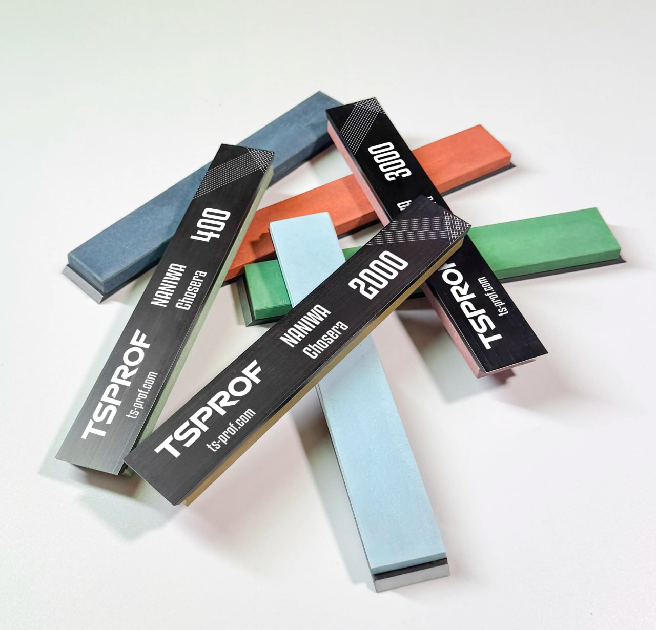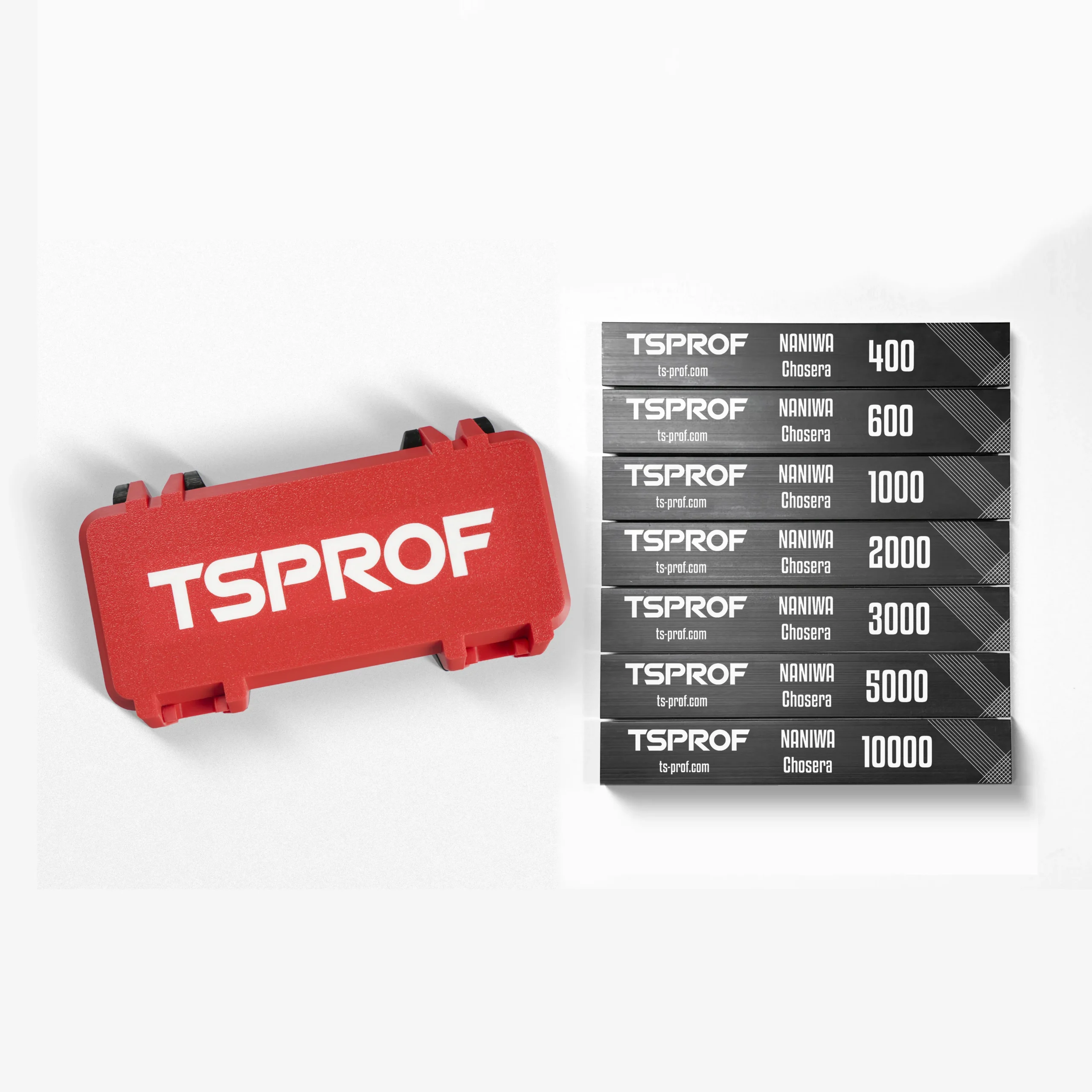 A professional set of Japanese water stones NANIWA Chosera, selected specifically for TSPROF sharpening systems. The set includes 7 stones in a handy plastic case, covering the full grit range from rough reprofiling to final edge polishing.