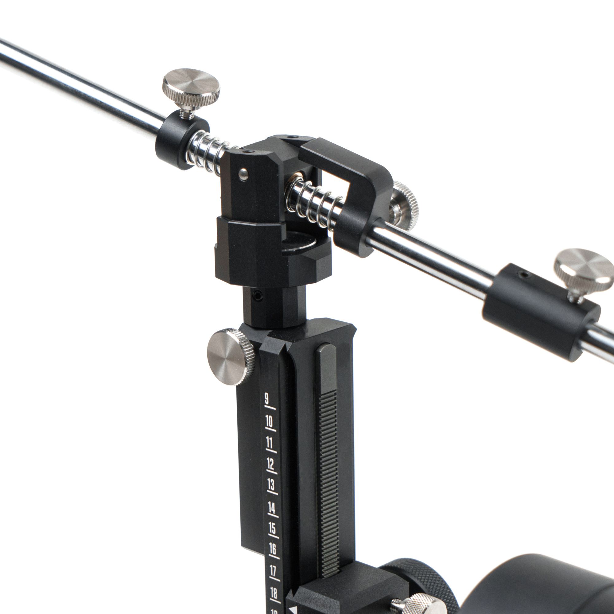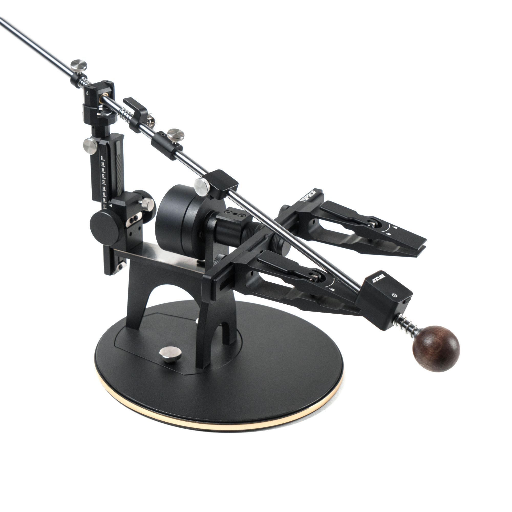 The universal holder allows you to use any abrasive stones with the sharpener, both with and without templates. The abrasive holder does not have a metal base, but thanks to the special geometry of the stops, it allows you to fix the abrasives as securely as possible. The abrasive holder rod has an increased length of 694 mm, is made of steel and has high rigidity. The holder rod is collapsible and is connected by an aluminium sleeve-coupling with a three-point mounting, which provides maximum alignment of the connection. The rod is equipped with a convenient wing screw for adjustment, and the rod is connected with a single movement.