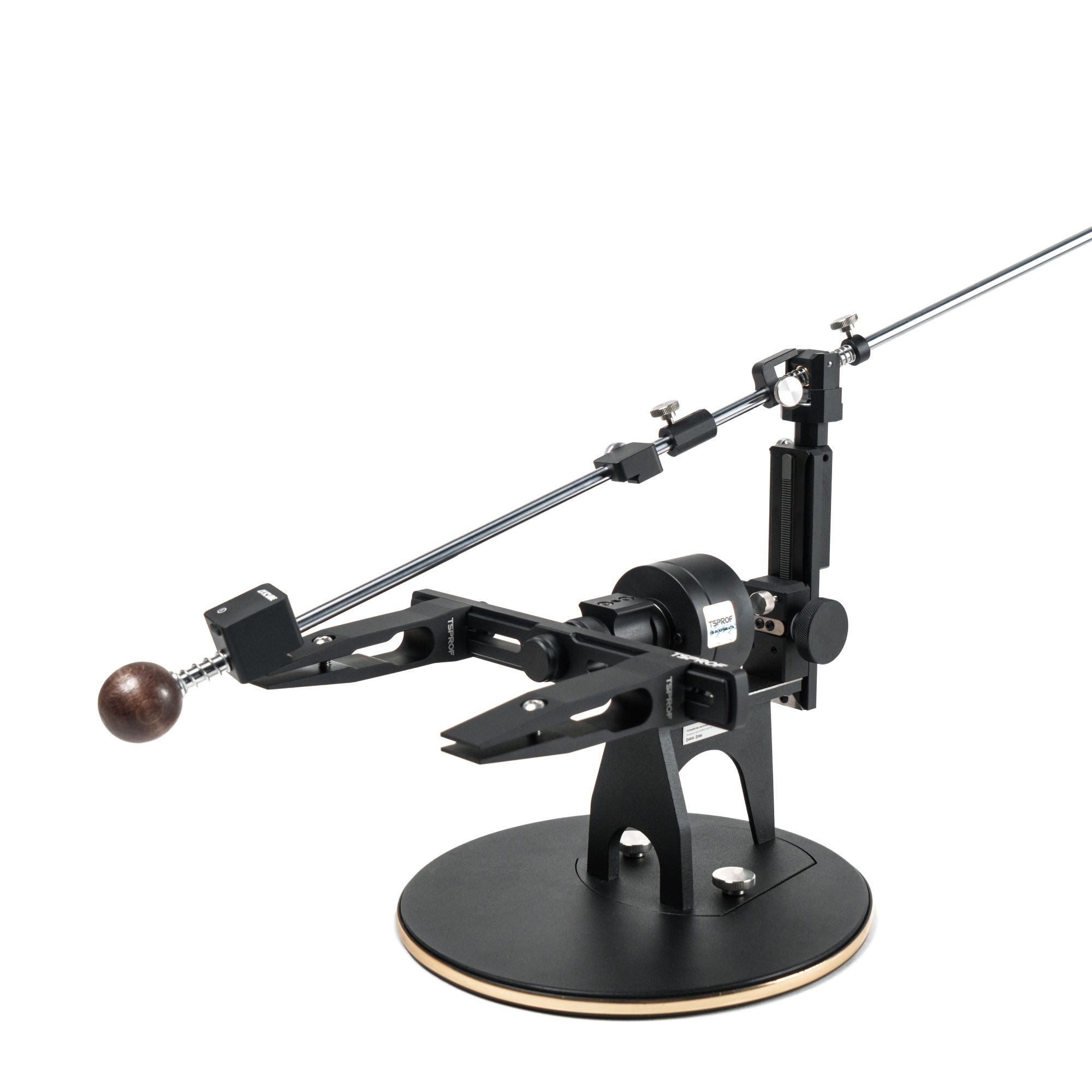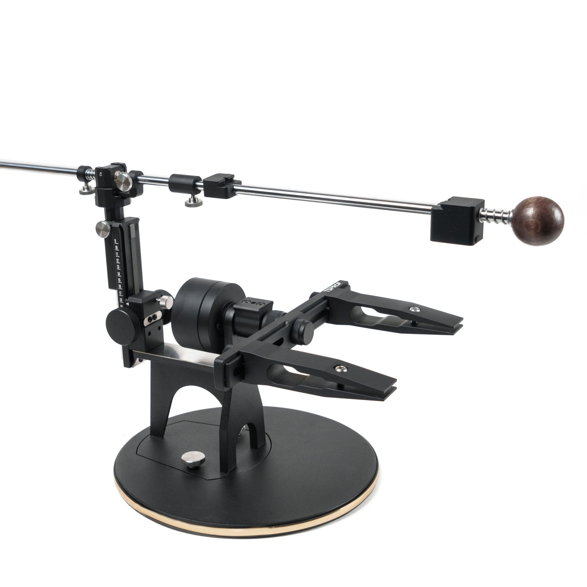 The universal holder allows you to use any abrasive stones with the sharpener, both with and without templates. The abrasive holder does not have a metal base, but thanks to the special geometry of the stops, it allows you to fix the abrasives as securely as possible. The abrasive holder rod has an increased length of 694 mm, is made of steel and has high rigidity. The holder rod is collapsible and is connected by an aluminium sleeve-coupling with a three-point mounting, which provides maximum alignment of the connection. The rod is equipped with a convenient wing screw for adjustment, and the rod is connected with a single movement.